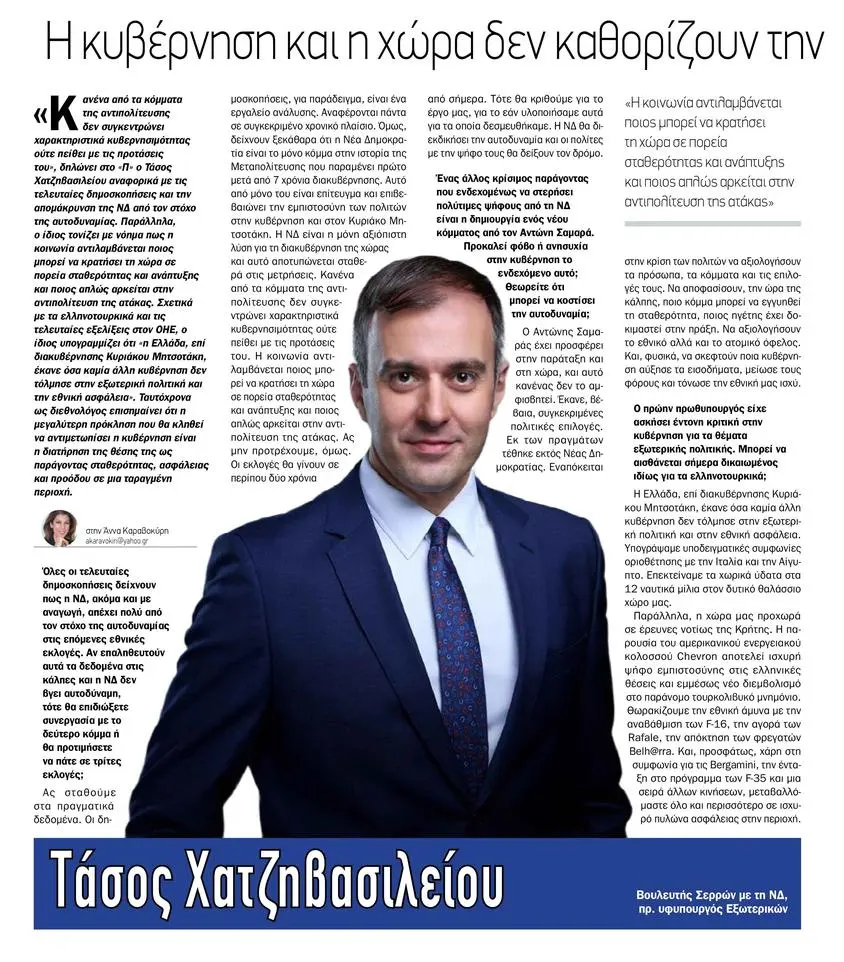Ο Αντώνης Σαμαράς έχει προσφέρει στην παράταξη και στη χώρα και αυτό κανένας δεν το αμφισβητεί. Έκανε, βέβαια, συγκεκριμένες πολιτικές επιλογές. Εκ των πραγμάτων τέθηκε εκτός Νέας Δημοκρατίας. Εναπόκειται στην κρίση των πολιτών να αξιολογήσουν τα πρόσωπα, τα κόμματα και τις επιλογές τους. Να αποφασίσουν, την ώρα της κάλπης, ποιο κόμμα μπορεί να εγγυηθεί τη σταθερότητα, ποιος ηγέτης έχει δοκιμαστεί στην πράξη. Να αξιολογήσουν το εθνικό αλλά και το ατομικό όφελος. Και, φυσικά, να σκεφτούν ποια κυβέρνηση αύξησε τα εισοδήματα, μείωσε τους φόρους και τόνωσε την εθνική μας ισχύ.