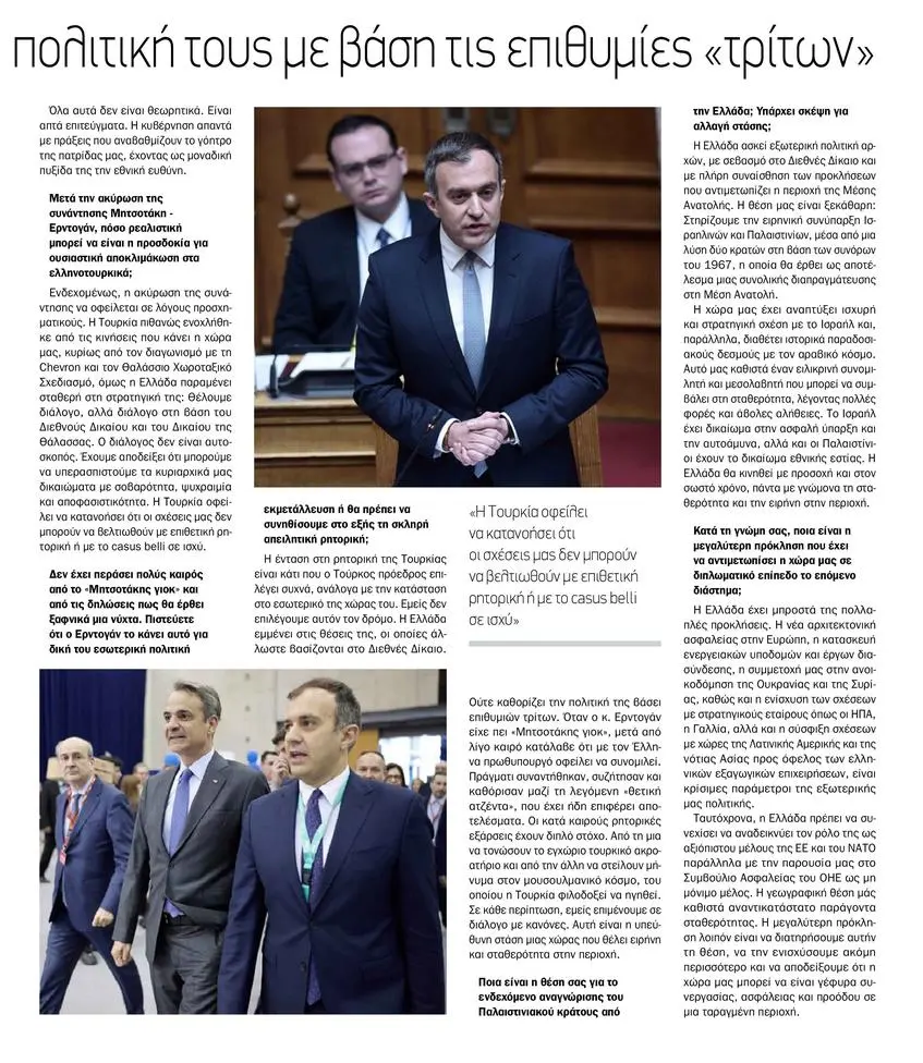 Η ένταση στη ρητορική της Τουρκίας είναι κάτι που ο Τούρκος Πρόεδρος επιλέγει συχνά, ανάλογα με την κατάσταση στο εσωτερικό της χώρας του. Εμείς δεν επιλέγουμε αυτόν τον δρόμο. Η Ελλάδα εμμένει στις θέσεις της, οι οποίες άλλωστε βασίζονται στο Διεθνές Δίκαιο. Ούτε καθορίζει την πολιτική της βάσει επιθυμιών τρίτων. Όταν ο κ. Ερντογάν είχε πει «Μητσοτάκης γιοκ», μετά από λίγο καιρό κατάλαβε ότι με τον Έλληνα Πρωθυπουργό οφείλει να συνομιλεί. Πράγματι συναντήθηκαν, συζήτησαν και καθόρισαν μαζί τη λεγόμενη «θετική ατζέντα» που έχει ήδη επιφέρει αποτελέσματα. Οι κατά καιρούς ρητορικές εξάρσεις έχουν διπλό στόχο. Από τη μια να τονώσουν το εγχώριο τουρκικό ακροατήριο και από την άλλη να στείλουν μήνυμα στο μουσουλμανικό κόσμο, του οποίου η Τουρκία φιλοδοξεί να ηγηθεί. Σε κάθε περίπτωση, εμείς επιμένουμε σε διάλογο με κανόνες. Αυτή είναι η υπεύθυνη στάση μιας χώρας που θέλει ειρήνη και σταθερότητα στην περιοχή.