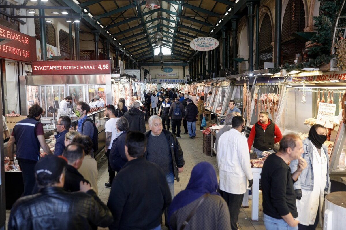 Παρά τα περιοριστικά μέτρα ο κόσμος έσπευσε στη Βαρβάκειο αγορά για να κάνει τα ψώνια του για το πασχαλινό του τραπέζι.