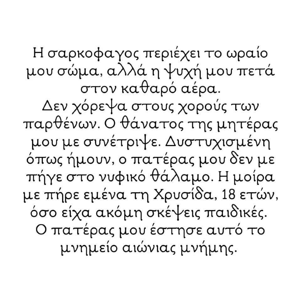 «Η σαρκοφάγος περιέχει το ωραίο μου σώμα, αλλά η ψυχή μου πετά στον καθαρό αέρα. Δεν χόρεψα στους χορούς των παρθένων. Ο θάνατος της μητέρας μου με συνέτριψε. Δυστυχισμένη όπως ήμουν ο πατέρας μου δεν με πήγε στο νυφικό θάλαμο. Η μοίρα με πήρε εμένα τη Χρυσίδα, 18 ετών, όσο είχα ακόμα σκέψεις παιδικές. Ο πατέρας μου έστησε αυτό το μνημείο αιώνιας μνήμης».