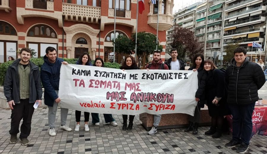 Εκδήλωση διαμαρτυρίας κατά της απόφασης της Ιεράς Συνόδου της Εκκλησίας της Ελλάδος να καθιερώσει ημέρα του αγέννητου παιδιού, πραγματοποίησαν μέλη της νεολαίας ΣΥΡΙΖΑ και του τμήματος φεμινιστικής πολιτικής – φύλου του ΣΥΡΙΖΑ στη Θεσσαλονίκη. Η εκδήλωση των νεολαίων του κόμματος της αξιωματικής αντιπολίτευσης στρεφόταν και κατά της καμπάνιας ενημέρωσης για τα δικαιώματα του αγέννητου παιδιού από τα 19 χριστιανικά σωματεία των Αθηνών.