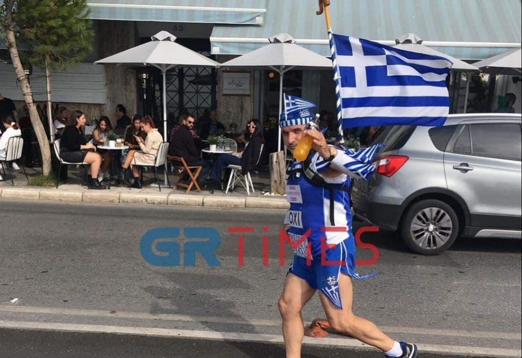 Γεμάτος ελληνικές σημαίες από την… κορυφή μέχρι τα νύχια, ένας μοναχικός δρομέας, τραβούσε τα βλέμματα οδηγών και πεζών από όπου και αν περνούσε σήμερα στη Θεσσαλονίκη.