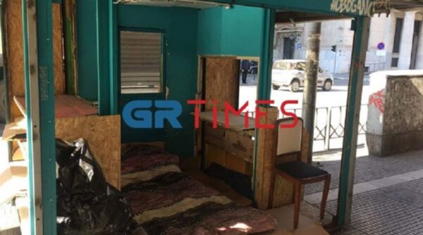 ‘Ενα ζευγάρι αστέγων στη Θεσσαλονίκη, δημιούργησαν ένα πρόχειρο καταφύγιο σε ένα εγκαταλελειμμένο περίπτερο, προκειμένου να αποφύγουν τις χαμηλές θερμοκρασίες. Το “δωμάτιο” του ζευγαριού βρίσκεται σε πολύ κεντρικό σημείο της πόλης.