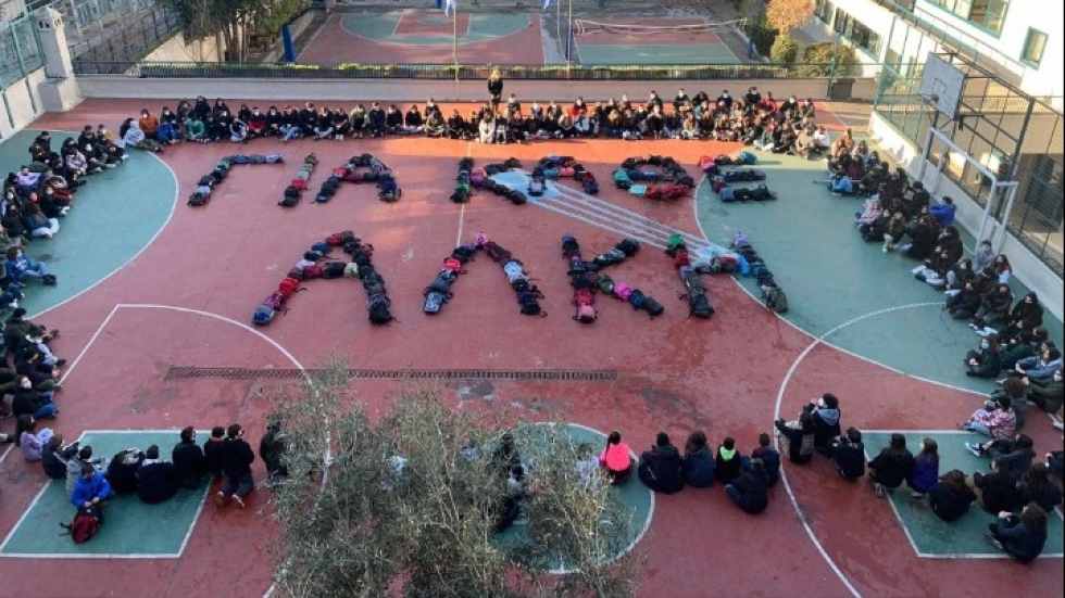 Σε μια κίνηση να εκφράσουν τη θλίψη τους για το αιματηρό περιστατικό, τα παιδιά συγκεντρώθηκαν στο προαύλιο του σχολείου και σχημάτισαν με τις τσάντες τους τη φράση «για κάθε Άλκη», το όνομα του νεαρού που έπεσε νεκρός.