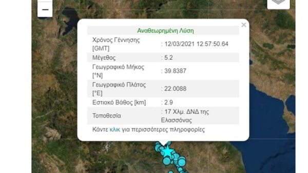 Ισχυρός σεισμός σημειώθηκε πριν από λίγο στην Ελασσόνα μεγέθους 5,3 βαθμών της κλίμακας Ρίχτερ.