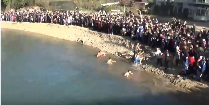 Παρά την χαμηλή θερμοκρασία, στους 2 βαθμούς Κελσίου, δεν έλειψαν οι τολμηροί που βούτηξαν στα παγωμένα νερά για να πιάσουν τον Τίμιο Σταυρό.