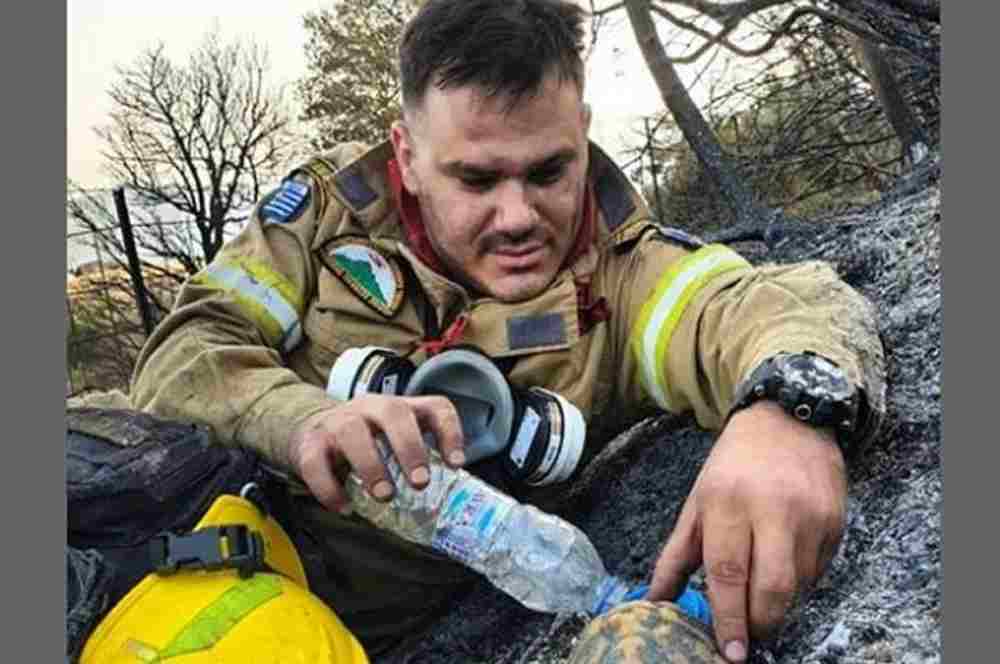 Viral έχει γίνει ο πυροσβέστης που μέσα στα καμένα στην Αχαΐα δίνει νερό σε μια χελώνα που αρχικά ο ίδιος και οι συνάδελφοί του νόμιζαν ότι είχε καεί.