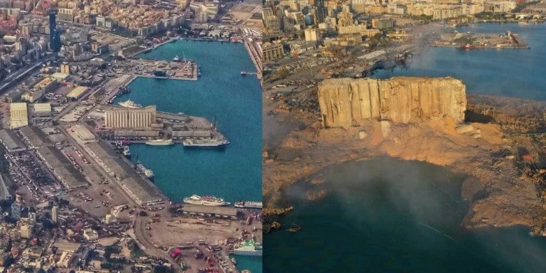 Όπως μπορείτε να διαπιστώσετε από τις φωτογραφίες, η έκρηξη στην αποθήκη με το νιτρικό αμμώνιο ήταν τόσο ισχυρή που κυριολεκτικά εξαφάνισε ένα μεγάλο κομμάτι ξηράς στο οποίο ήταν χτισμένη η αποθήκη.