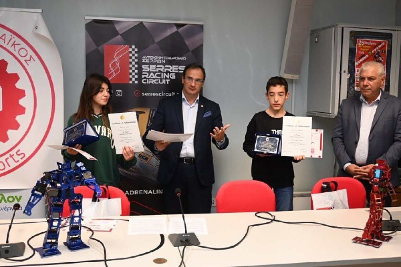 Ο κ.Χρυσάφης συνεχάρη τους 13χρονους Σερραίους αθλητές για τη σημαντική τους επιτυχία στον μεγαλύτερο παγκόσμιο διαγωνισμό ρομποτικής και τους απένειμε τιμητικές πλακέτες στη διάρκεια εκδήλωσης, που πραγματοποιήθηκε σήμερα, Σάββατο 12 Νοεμβρίου στο Αυτοκινητοδρόμιο Σερρών.