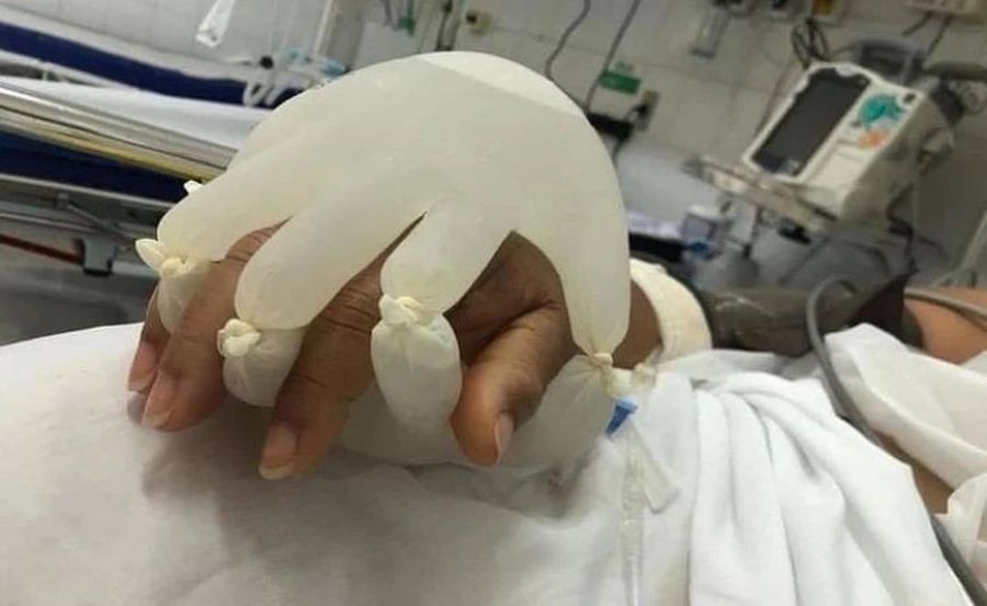 Μια εικόνα που αναρτήθηκε στα social media δείχνει το χέρι ενός ασθενή σε κρεβάτι νοσοκομείο. Βρίσκεται ανάμεσα σε δύο λαστιχένια γάντια, γεμάτα με ζεστό νερό.