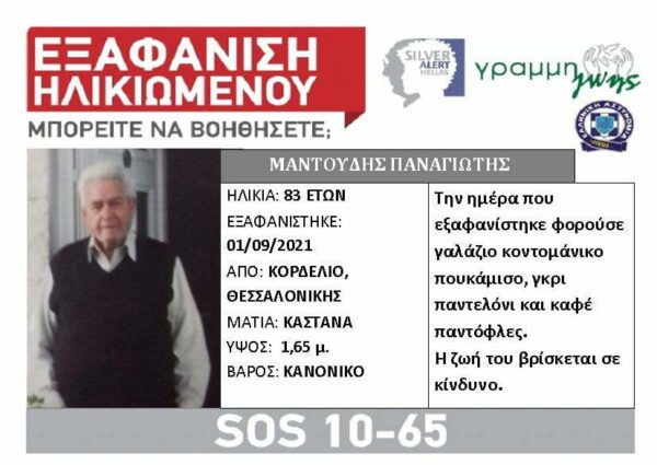 Η ΓΡΑΜΜΗ ΖΩΗΣ, ειδοποιήθηκε από τους οικείους του το απόγευμα της 02/09/2021 και μετά τη συγκέντρωση των απαιτούμενων δικαιολογητικών, ενεργοποίησε τον Κοινωνικό Συναγερμό SILVER ALERT, για την κινητοποίηση όλων για την ανεύρεσή του.