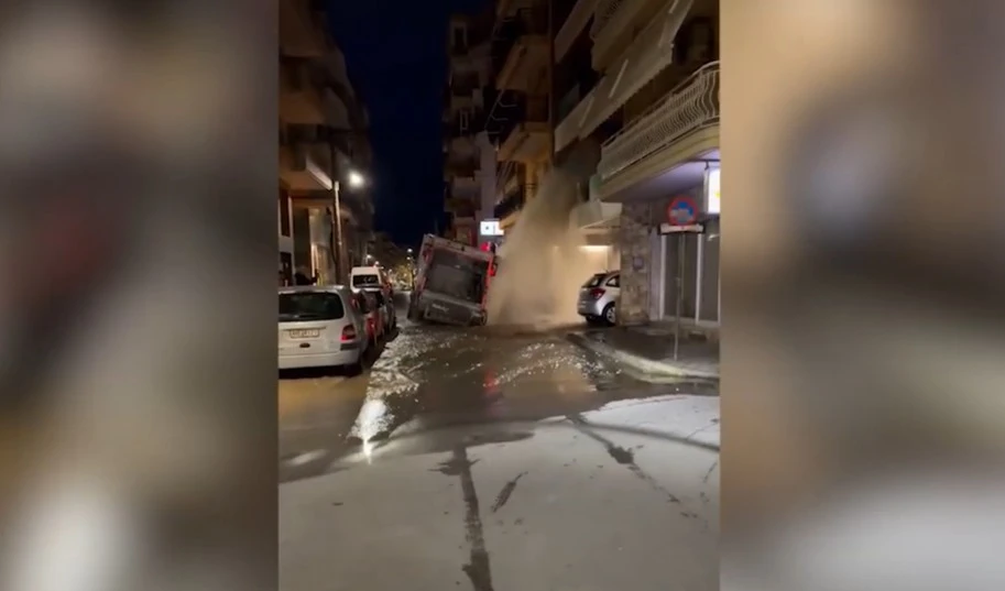 Από τη ζημιά προκλήθηκε τεράστια διαρροή νερού, δημιουργώντας ένα εντυπωσιακό «σιντριβάνι» που έφτανε έως τον πρώτο όροφο πολυκατοικίας, με το νερό να καταλήγει στο μπαλκόνι διαμερίσματος.