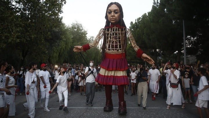 Πλήθος κόσμου, τηρώντας τα μέτρα προστασίας για την Covid-19, συγκεντρώθηκε στην πλατεία Ασωμάτων στο Μοναστηράκι και συνόδευσε την μαριονέτα με ύψος 3,5 μέτρα που διανύει ένα μεγάλο ταξίδι 8.000 χιλιομέτρων με τελικό προορισμό το Μάντσεστερ στην Αγγλία.